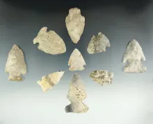 Set of nine assorted points, largest is 1 7/8". Found in Hillsdale Co., Michigan, near Sand Lake. |