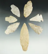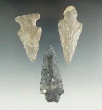 Set of three assorted points found in Hillsdale Co., Michigan, largest is 2 3/4". Ex. Charles Shephe