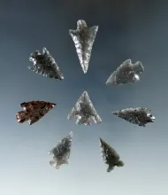 Group of eight obsidian arrowheads found in Humboldt Co., Nevada, largest is 1 1/8". All in very nic |