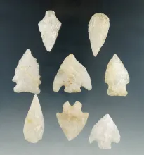 Set of 8 nicely flaked quartz arrowheads found in Greenwich, New Jersey. |