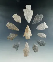 Set of 12 assorted arrowheads found in New Jersey, largest is 2 3/8". |