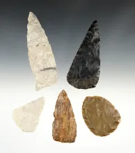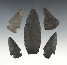 Set of 5 nicely patinated Basalt points found in New Mexico. The largest is 3 1/8". | NEW MEXICO | 35.00 | |
