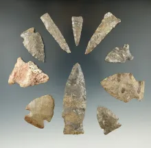 Set of 10 assorted arrowheads found in New York, largest is 1 3/4". | NEW YORK | 100.00 | |