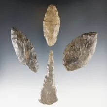 Set of four assorted Woodland Period Flint knives recovered in New York. Largest is 3 5/8". |