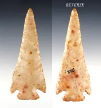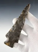 3 7/16" classic Coshocton Flint Archaic Thebes with exquisite flaking. Found in Ross Co., Ohio. |