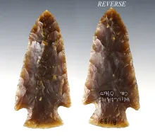 3" highly colored Coshocton Flint Expanded Notch Bevel found in Stark Co., Ohio. Bennett COA. |