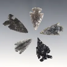 Nice set of 5 assorted arrowheads made from Obsidian. Found in Oregon. Largest is 1 1/16". |
