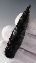 1 1/8" well flaked Eastgate Split Stem made from Obsidian. Found near the Columbia River in Oregon. |