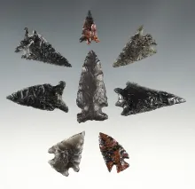 Set of 8 well made Obsidian points found in Lake Co., Oregon. The largest is 1 11/16". |
