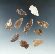 Set of 10 assorted arrowheads which were glued to a board found in the Dakotas, largest is 1 9/16". |