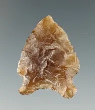 1 1/2" Scottsbluff made from Knife River Flint with a fire-pop on reverse side. Found in Eastern SD.