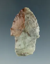 Very nice color pattern on this 1 9/16" stemmed dart point with heavily ground stem area. Utah. |