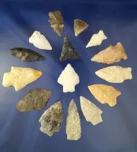 Group of 14 assorted Arrowheads found in North Carolina and Virginia. Largest is 1 3/4". |