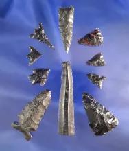 Set of nine assorted Obsidian artifacts found in Oregon, largest is 2 1/2". |