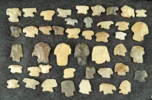 Large group of mostly Knife River Flint scrapers found in the Dakotas. Largest is 2 5/16". |