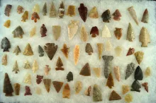 Group of assorted arrowheads and scrapers found in the Dakotas, largest is 1 5/8". |