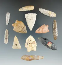 Group of Ohio artifacts including five points and seven drills. Largest is 1 15/16". |