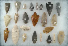 Group of 13 assorted Columbia River arrowheads and drills, largest is 1 5/8". |