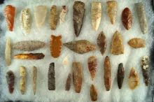 Group of assorted arrowheads and scrapers found in the Dakotas, largest is 1 5/8". |