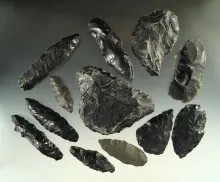 Set of 12 assorted obsidian artifacts found in the Great Basin area, largest is 3 3/8". |