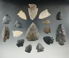 Group of 16 assorted field found Flint artifacts, largest is 2 5/8". Found in Richland Co., Ohio . |