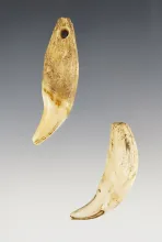 Pair of Bear Teeth. 1 is drilled. Found in Cayuga Co., New York. The largest is 2 7/16". |