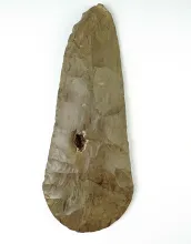 10 1/4" Spade made from Mill Creek Chert. Missouri. Excellent use wear to the bit. |