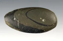 6 1/8" black slate three hole Glacial Kame Sandal Sole Gorget. Found in Wood Co., Ohio. |