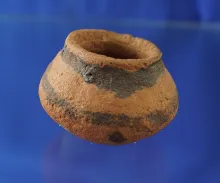 5 1/4" Tall Solid Mississippian Shell Tempered Clay Jar with suspension holes by rim. Shipley. |