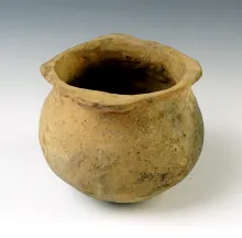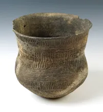 4 1/4" wide x 3 1/2" tall Mississippian pottery vessel in solid condition. |