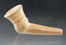 3" Wide Iroquois Clay Flared Bowl Pipe with nice incising to front of hole. New York. Restoration. NEW YORK 250.00