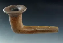2 7/8" miniature Iroquois clay trumpet pipe which is mended at the elbow found in New York. |