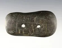 4 1/8" Gorget that is well patinated. Found in Ohio. Has several lines engraved across one face. |