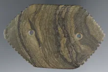3 1/2" Very unique Six-Sided highly banded Glacial Slate Gorget with unique fringing on four sides. |