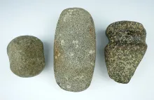 Set of three stone tools found in Ohio including a Grooved Hammerstone, Grooved Axe, and a Celt |