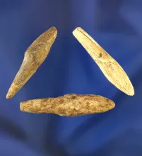 Set of three bone artifacts including a 4" bone needle, from the Bill Peterson collection. |