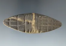 3 1/4" Eliptical tie-on Atl-Atl Weight with grooved ends that is highly engraved, Ohio. Ex. Hasewink OHIO 900.00