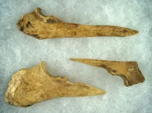 Group of assorted bone and antler artifacts collected at the Riker site, largest is 2 1/2". |
