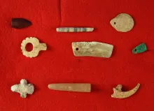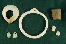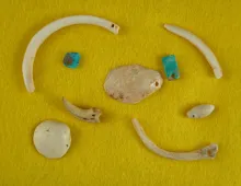 Set of artifacts found in Arizona including turquoise drilled beads, shell beads and bone pendants. |