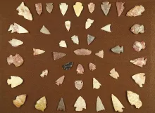 Large group of 40+ assorted arrowheads found in the Kansas area glued to a board. |