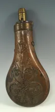 7" tall brass powder flask with a floral design from the mid 1800s. |