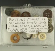 Group of assorted buttons found on several sites near the Columbia - bone, shell, brass, glass. |