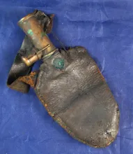 Early 1800s Priming Horn with wood plug and owners initials carved on top with original leather stra