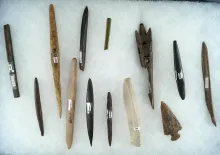 13 assorted Awls, Bladelets, a cornernotch point, and an Alaskan Harpoon Tip. |