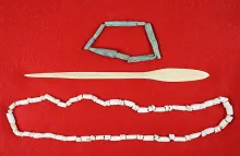 Bone fishhook and two Cannel coal artifacts found at a site in southern Ohio. Hook measures 2 5/8". |