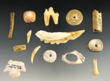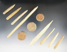 Eight Bone Awls and three clay miniature Ft. Ancient Discs. Found in Southern Ohio. |