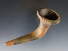 3 3/4" trumpet style Iroquois clay pipe with nice edge work around bowl. Some restoration. |
