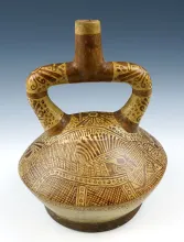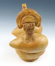 10" tall x 5 3/4" wide Moche stirrup pot with a high status figure motif - Peru. |