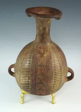 Highly detailed Moche 4-chamber stirrup handled vessel - broken and glued in two places. Peru. |
