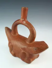 7 5/8" Moche seal pup effigy stirrup bottle found in Peru. |